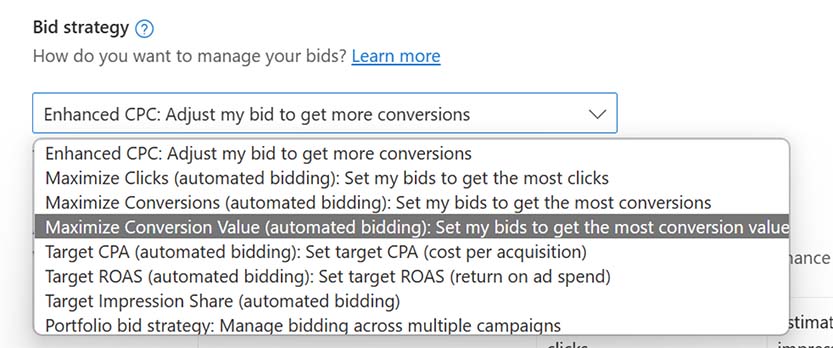 For more information on Maximize Conversion Value and other available bid strategies, see Let Microsoft Advertising manage your bids with bid strategies.