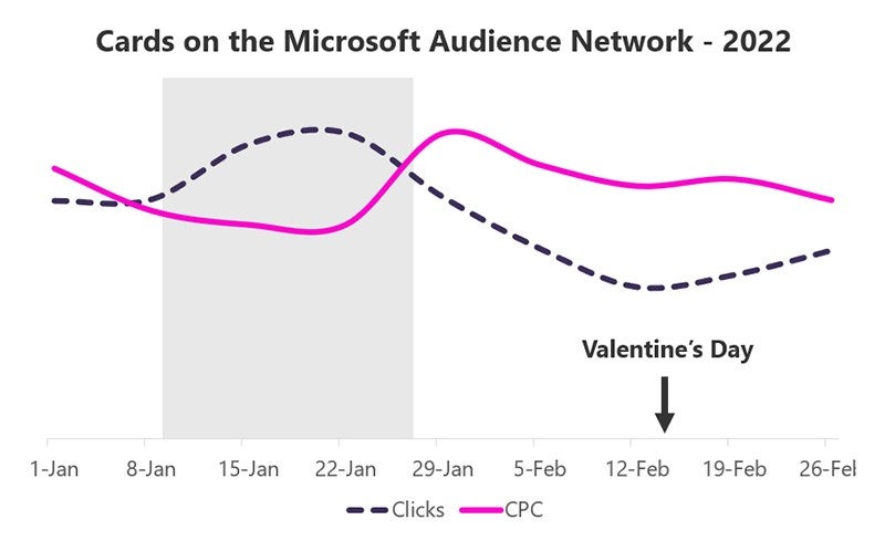 4. By targeting users in-market for cards in January, you’ll see better results in terms of cost per click (CPC) on the Microsoft Audience Network. As we get closer to the holiday and expand into February, CPCs start increasing as clicks go down.1